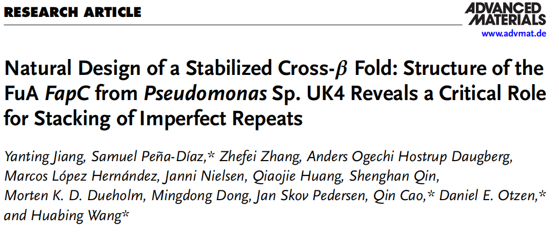 近日,上海交通大学Bio-X研究院曹骎课题组与丹麦奥胡斯大学Daniel E. Otzen院士团队及广西医科大学第一附属医院王华丙团队合作,在《Advanced Materials》发表了题为“Natural Design of a Stabilized Cross-β Fold: Structure of the FapC from Pseudomonas Sp. UK4 Reveals a Critical Role for Stacking of Imperfect Repeats”的研究成果(图1)。该工作通过冷冻电镜(cryo-EM)首次解析了假单胞菌UK4菌株功能性淀粉样蛋白(Functional Amyloid,FuA)FapC的高分辨率(3.2 Å)结构,揭示了其通过不完全重复单元(Imperfect Repeats, IRs)的异质性堆叠形成稳定希腊钥匙状原纤维的分子机制,为细菌生物膜形成机制及新型生物材料设计提供了结构基础,也是具有IRs的FuA首个能辨别氨基酸残基侧链的高分辨率结构。