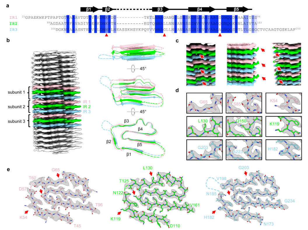 FuA是细菌生物膜的关键结构组分,其独特的交叉β折叠构象赋予材料超强稳定性与可编程特性,被视为下一代纳米生物材料的理想模板。然而,由于缺乏高分辨率结构信息,FuA的精确自组装机制及工程化改造长期面临瓶颈。FapC作为假单胞菌生物膜的核心蛋白,由三组IRs(IR1-IR3)构成,但其原子级结构及IRs间的互作模式此前尚未明确。