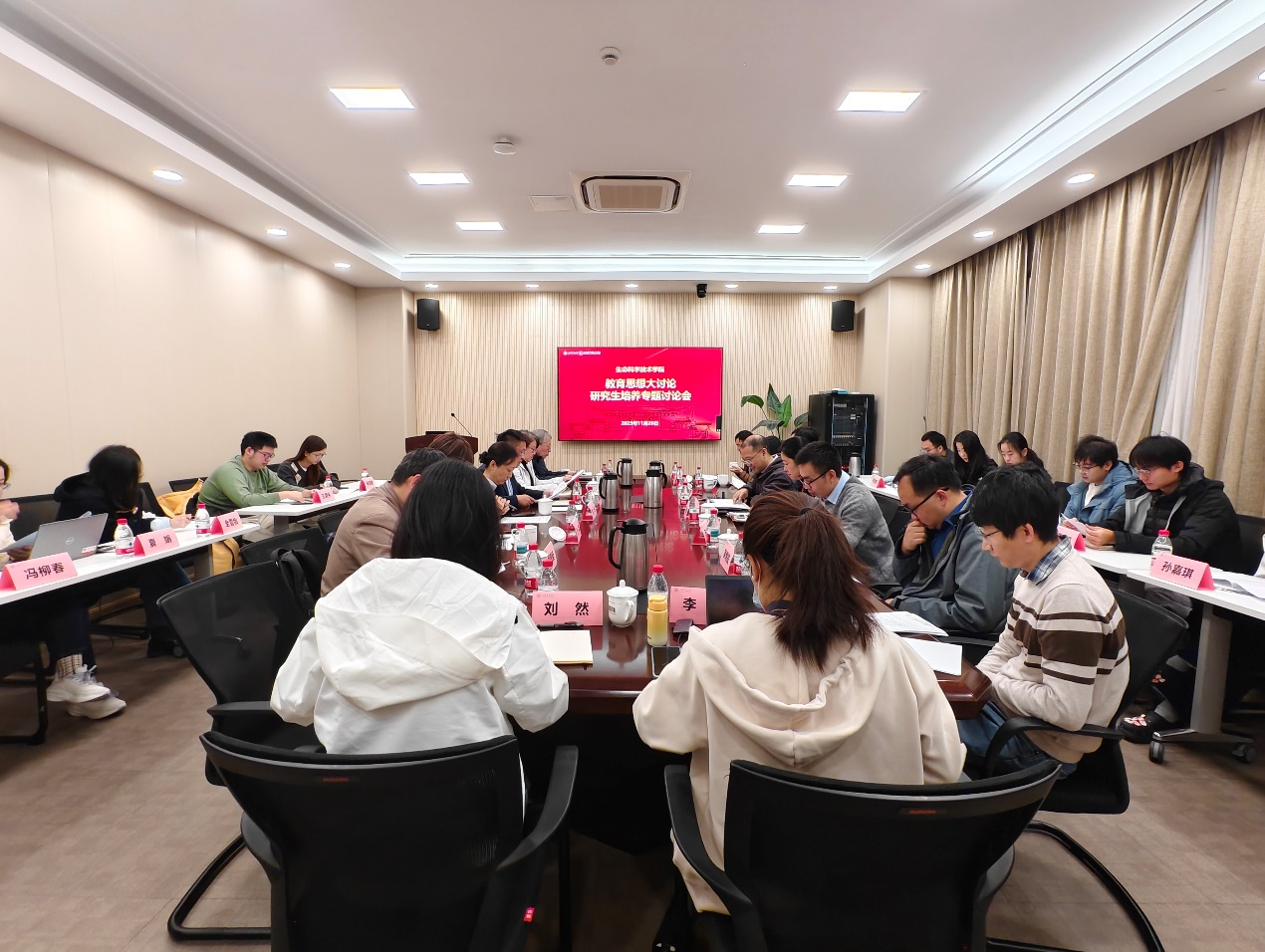 2025年11月20日,生命科学技术学院在生物药学楼2-116会议室举办导师培训暨研究生培养专题讨论会,共话新时代育人使命与创新机制。上海交通大学研究生院培养办公室主任仇浩、高层次交叉创新人才培养办公室王文竹应邀出席会议。学院副院长唐鸿志、李丹,各系教学副系主任、新晋导师代表、任课教师代表、荣誉计划博士生代表、各年级博士生代表及教学秘书共同参会,围绕研究生培养过程中的关键专题展开深入交流。会议由唐鸿志主持。
