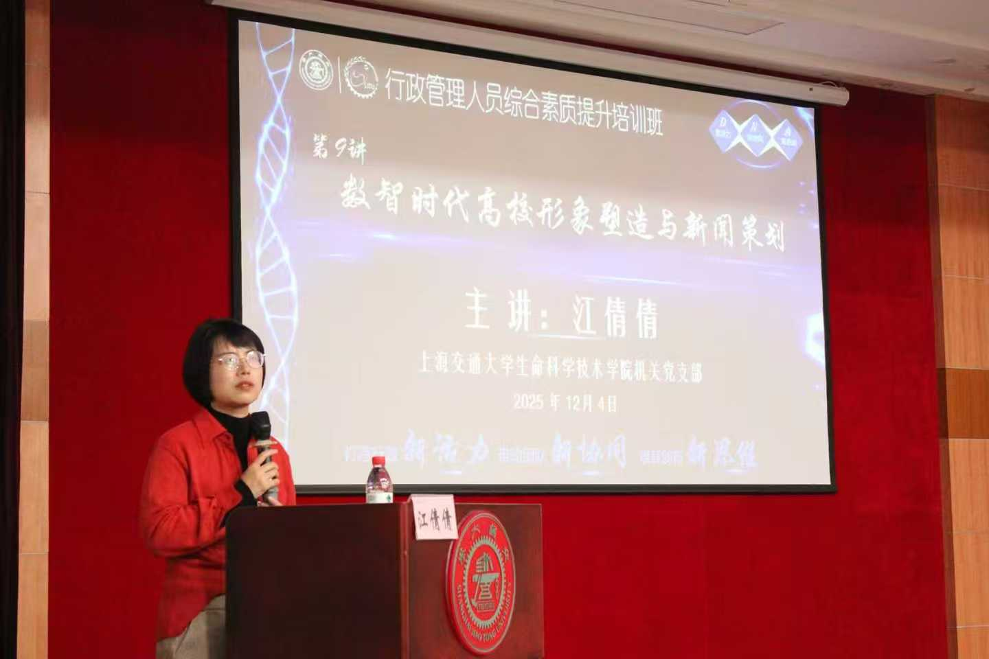 为深化党建与业务工作融合,切实增强行政人员在新媒体环境下的宣传履职能力,12月4日,生命科学技术学院机关党支部与药学院管理服务党支部联合开展“党建赋能行政管理,宣传聚力声量提升”主题党日活动,同期举办生命科学技术学院第九期“行政管理人员综合素质提升培训班”。学校党委宣传部新闻中心编委、外宣事务主任江倩倩老师应邀作专题辅导。生命科学技术学院党委副书记王鑫、张燕红,以及药学院管理服务党支部、生命科学技术学院机关党支部和行政团队、科研团队宣传专员等参加活动。活动由王鑫主持。