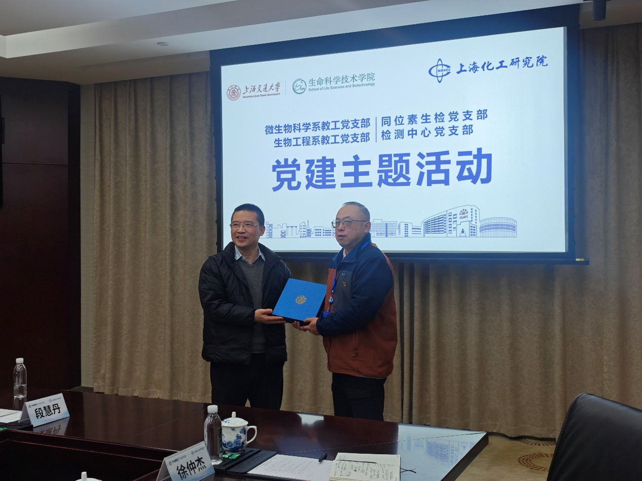 2025年12月12日下午,生命科学技术学院微生物科学系教工党支部、生物工程系教工党支部党员在学院党委副书记王鑫,党支部书记徐俊、陶飞的带领下,前往上海化工研究院(华谊集团中央研究院)开展联合共建主题党日活动。上海化工研究院党委书记、董事长褚小东,党委副书记、总经理商照聪和同位素生检党支部、检测中心党支部党员共同参加活动。本次活动旨在加强学院和上海化工研究院在科学研究和产业转化领域的合作交流,促进产学研深度融合,加速科技创新成果转化,共同探索生物化工在科学发展和产业升级建设中的贡献与价值。